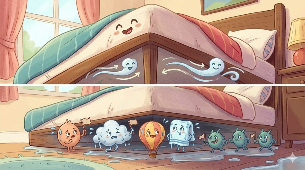 私たちが寝ている間、マットレスの底面と床の間には湿気が閉じ込められ、局所的に湿度が90%以上に達することも珍しくありません。