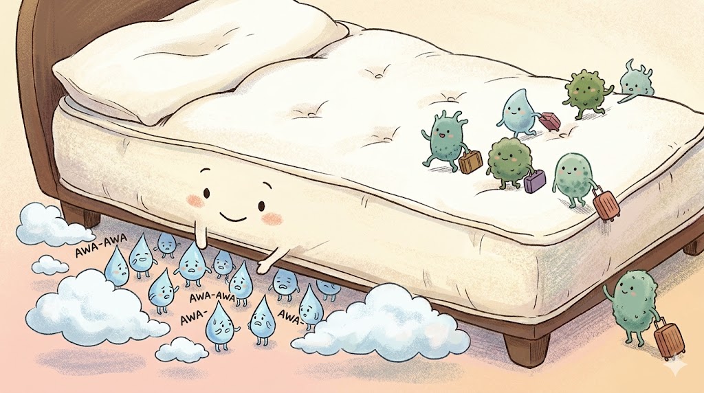 一晩中かいた汗と体温が残っているマットレスに、そのまま布団を被せてしまうと、熱と湿気を閉じ込める「蒸し風呂」のような状態を自ら作ってしまうことになるからです。