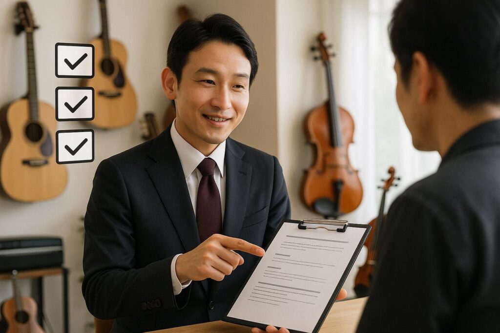 約束の日時に査定員が自宅を訪問し、玄関先などで楽器の状態を丁寧に査定してくれます。