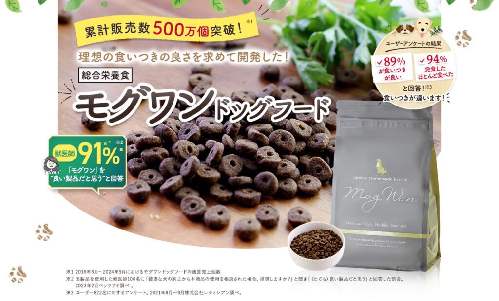モグワンは、累計500万個を突破し、獣医師の91%からも高く評価されている、まさに「こだわりの一袋」です。