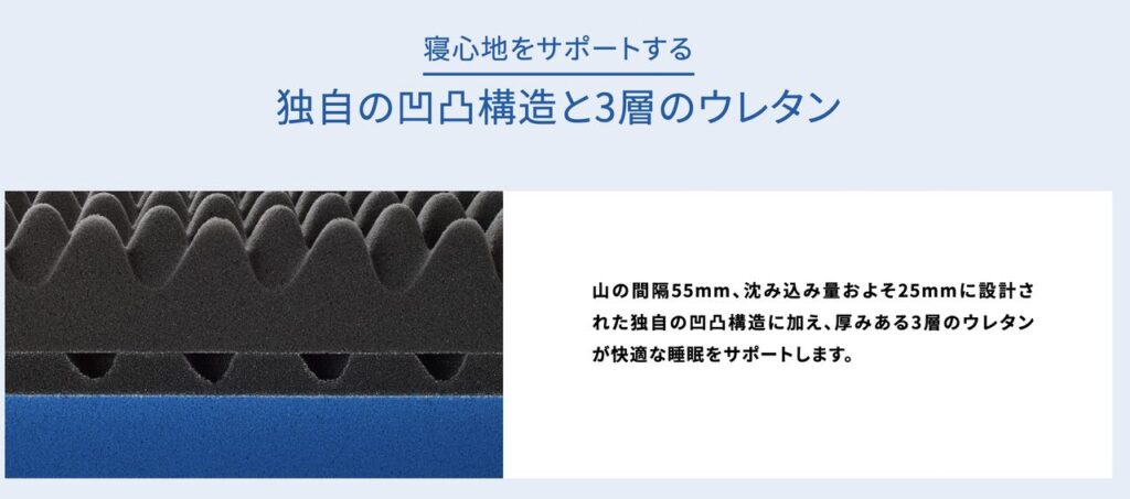 独自の凹凸構造としっかりした厚みがあるため、「敷き布団」と「マットレス」の2枚分の役割を、たった1枚で果たしてくれるんです。