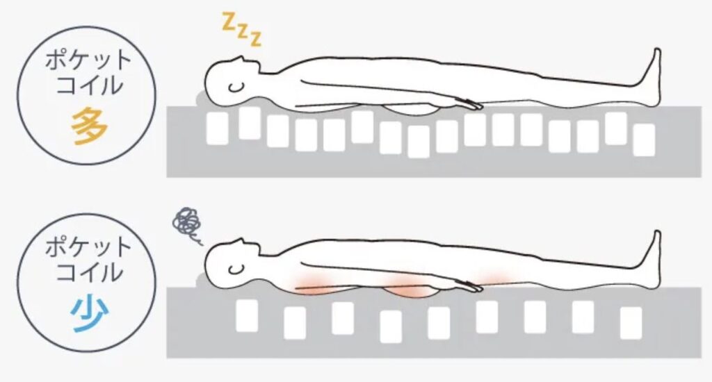 コイルの数が多いということは、体を支える「点」がたくさんあるということ。これにより、体圧(体重による負荷)がきれいに分散され、体の一部だけに負担がかかるのを防ぎます。「包み込まれるようなフィット感」と「しっかり支えられる安定感」の両方を実現しているからこそ、多くの人が寝心地が良いと感じるのです。