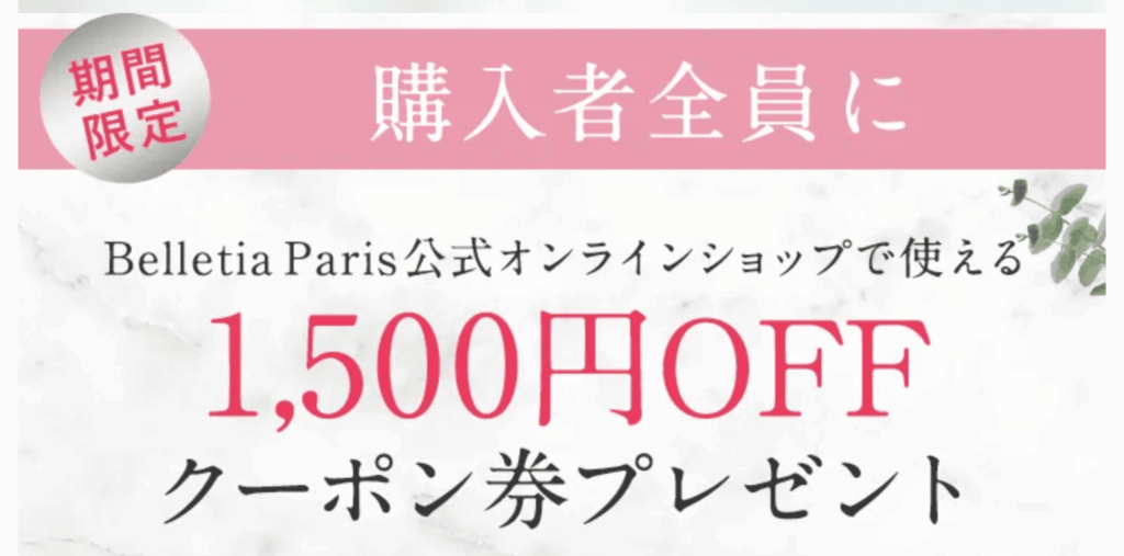 実は、購入者全員へのプレゼントとして、公式サイト(Belletia Paris)で使える1,500円OFFクーポンが配布されているんです。